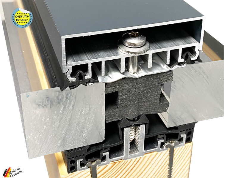 Glasbefestigungsprofile mit Aluminium Unterschiene und großer isolierender Dichtung speziell für eine Wohnraumverglasung mit Dreifachglas. Für Glasdächer oder Glaswände einsetzbar und geprüft. Die große isolierende Dichtung mit wasserführender Ebene deckt auch die Verschraubung des Unterprofils ab und zusätzlichem Dämmelement. Geeignet für Unterkosntruktionen mit 50 mm, 60 mm, 80 mm oder 100 mm breite.